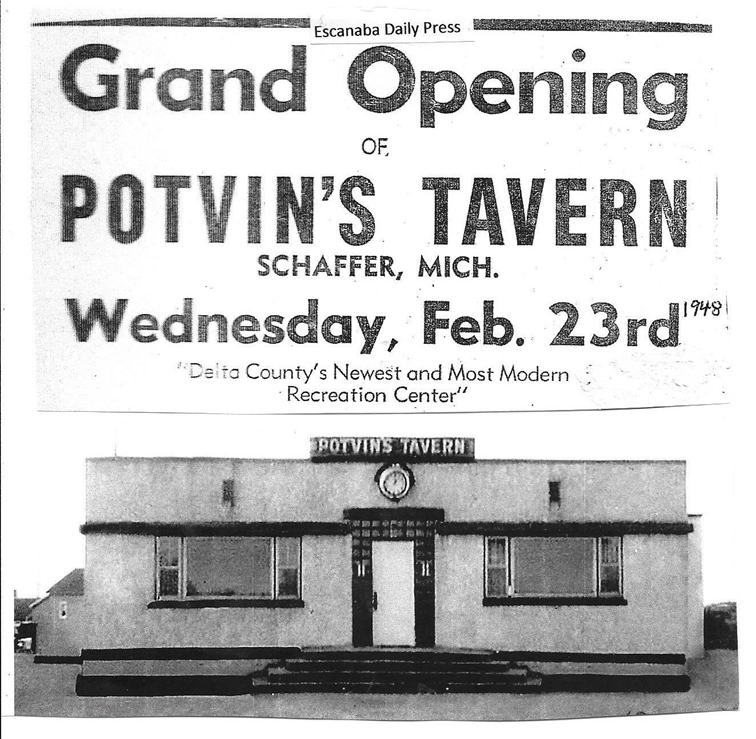 When prohibition was repealed Joseph Potvin approached Art Saindon who owned the property, in 1933. It had been locked by the feds due to prohibition violation and now was opened up. Joseph Potvin applied for a Beer and Wine License and received it, one of the first in the Delta County. He named it the SCHAFFER TAVERN AND HOTEL.